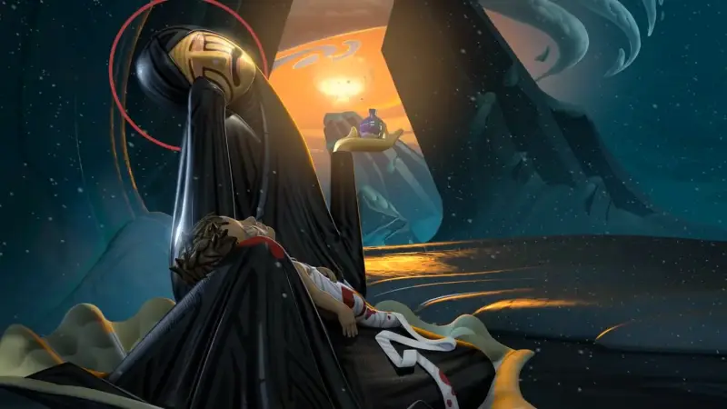 U prethodnoj sceni nam je prikazano kao da je duh ovog lika već ušao u svijet, dok je simbolično izbijao iz zemlje. Ovaj noviji unos je stvarni fizički primjerak. Ova se figura zatim budi i otvara oči prema spektakularnom izlasku sunca, koji se odražava na vodi i raznim simbolima prošlosti i sadašnjosti koji se rastvaraju oko njega. Preporučujem da ga sami pogledate, ako ga do sada niste pogledali.