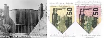 Gornja slika prikazuje noviju i stariju novčanica od 50 dolara, sa malim promjenama. Donja slika prikazuje stvarne tornjeve ispred ove brane, koji su prikazani na ovoj presavijenoj novčanici. Vrlo vjerojatno gledate sljedeći 11. rujna. Ovaj put 11. veljače. Baš kao što je "pandemija" proglašena 11. veljače, ili Fukushima 11. rujna.