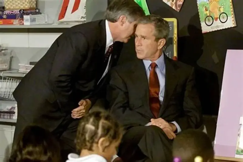 Točno u 9:06 ujutro je Bushov nastup naglo prekinuo čovjek koji se nagnuo nad njega, navodno ga obavijestivši kako se u drugi toranj WTC-a zabio avion i da je Amerika napadnuta.