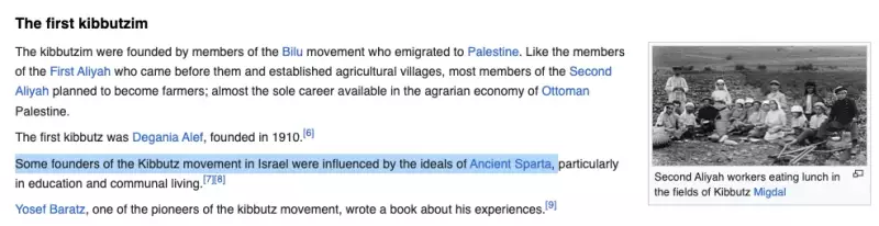 Što se tiče kibuca, izraelskih "sekularnih" kolektivnih farmi u kojima se rađaju i odgajaju tvrdokorni ljudi, mnogo toga se može reći o tome kako su nastali i zašto. Skuhali su ih komunistički revolucionari koji su postali cionisti kako bi stvorili državotvorne komandose. Sama veza sa Spartom nije nikakvo ezoterično znanje, budući kako se može naći na Wikipediji.