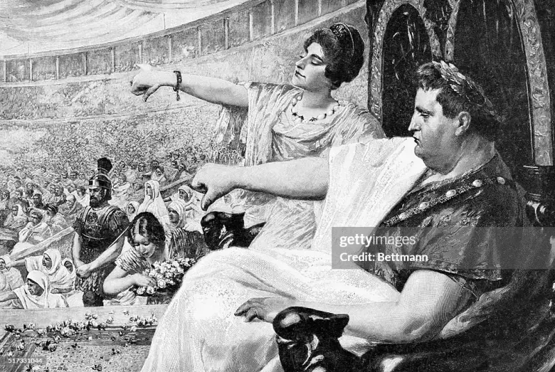 Ilustracija prikazuje cara Nerona kako pruža "Palac dolje", označavajući smrt gladijatora