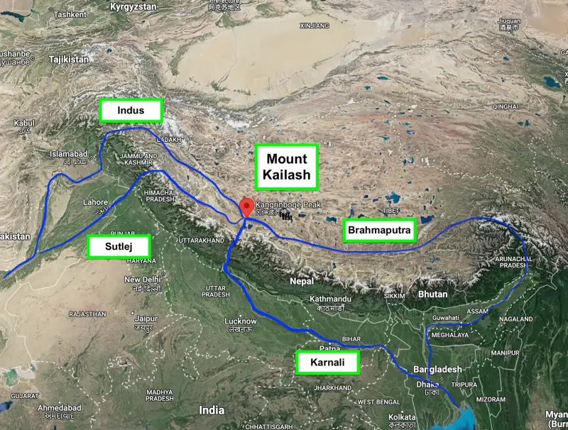 U hinduizmu, planina Kailash također predstavlja planinu Meru, os svijeta. Hinduisti vjeruju kako je Lord Shiva zajedno s Parvati ostao na vrhu Kailasha. Slávratta, 'nebeska zemlja' Hindusa, jest vrh njihove zlatne planine Meru. Tu se nalazi grad Brahma, u središtu Jambadwípe, s čije četiri strane izviru četiri prarijeke. Sve je ovo u slavu njihova izvora, te rijeke pojedinačno teku prema sjeveru, jugu, istoku i zapadu.