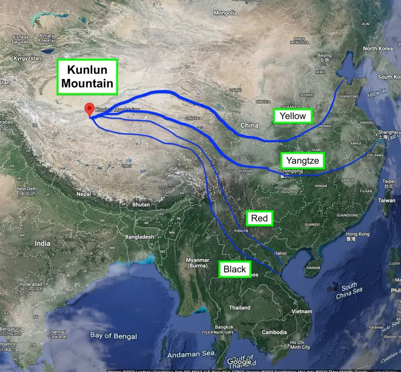 Četiri rijeke su Crvena rijeka, Žuta rijeka, Crna rijeka i rijeka Jangce: