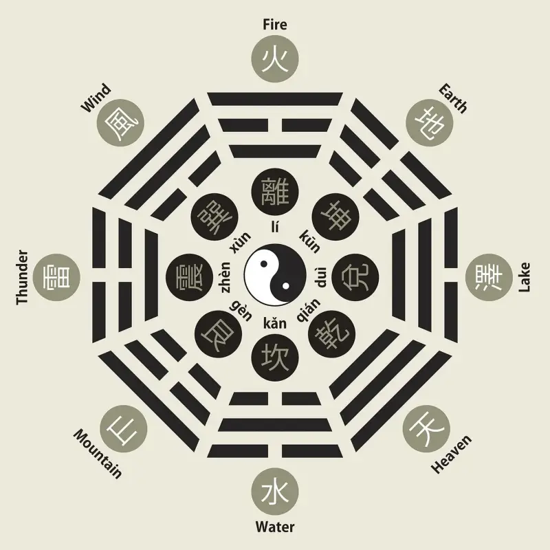 Ovaj skup se temelji na taoističkoj kozmologiji i predstavlja temeljna načela stvarnosti; viđen kao niz od osam međusobno povezanih koncepata - kako se koristi u Feng Shuiju i I Chingu. Ovu verziju (kasnije nebo), koristi Luo Pan kompas, koji se koristi u Feng Shuiju za analizu kretanja Qija. Trigrami odgovaraju pet elemenata: astronomiji, astrologiji, geografiji, geomantiji, anatomiji, obitelji itd. Ako bolje pogledate, Kainov znak je skriven unutar Yina i Yanga taoizma.