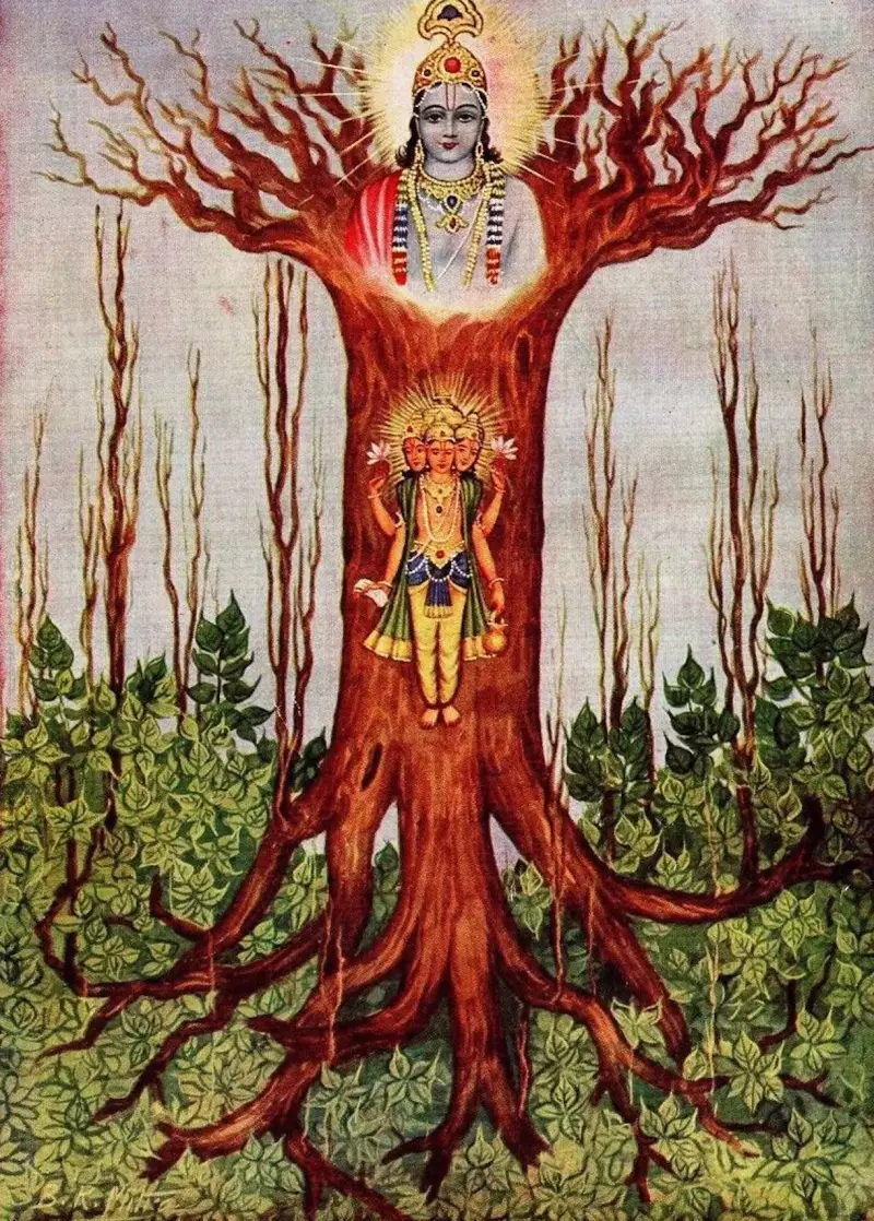 "Postoji drvo banyan čije je korijenje okrenuto prema gore, a grane prema dolje, a vedske himne su njegovo lišće. Onaj tko poznaje ovo drvo je poznavalac Veda."