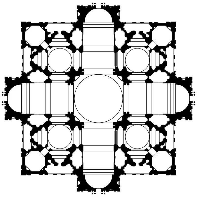 "Bez uništavanja centralizirajućih značajki Bramanteova plana, Michelangelo je s nekoliko poteza pera pretvorio njegovu kompleksnost pahulje u masivnu, kohezivnu cjelinu."