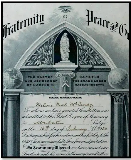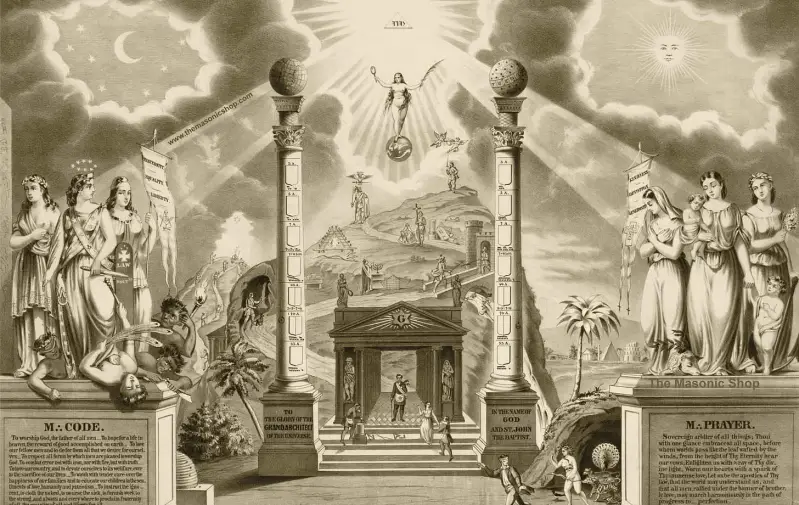 Masonsko svjedočanstvo inicijacije. Obratite pažnju na tri stupa. Srednji stup, djelomično zaklonjen, poravnat je duž iste okomite osi kao i masonsko oko.