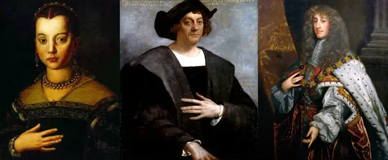 Catherine de’ Medici, Christopher Columbus i King James II s kabalističkom gestom, označavajući lijevu stazu inicijata, što znači tajnu stazu tame