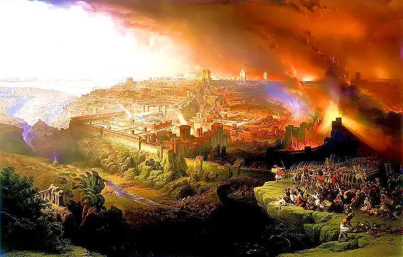 Hram je uništen 70. godine, tijekom četverogodišnje židovske pobune protiv Rima. Tit je opsjedao, i na kraju spalio grad do temelja, raspršivši Židove po cijelom carstvu.
