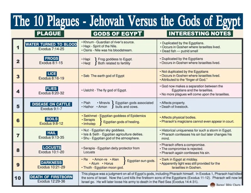 Egipćani su štovali više od 40 lažnih bogova, ali nijedan od njih nije spomenut u Bibliji. Egipat je u Bibliji sinonim za Izlazak i Mojsija. Mojsije govori faraonu neka pusti židovski narod u njihovu obećanu zemlju u Kanaanu, ali faraon to odbija.
