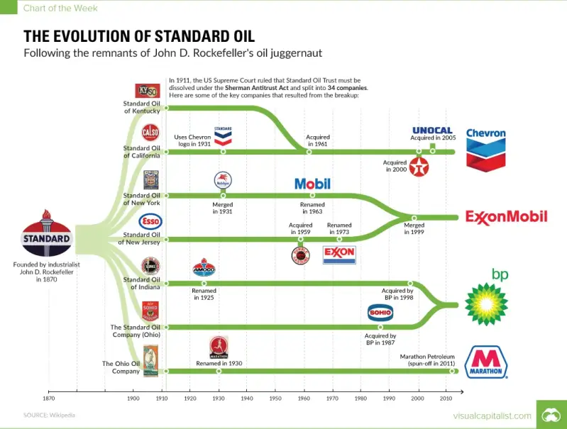 1911. godine, kada je Kongres pokušao ograničiti monopolističke kartele, kao što je Standard Oil, donošenjem Shermanova antimonopolskog zakona, Rockefeller i ostali "pljačkaški baruni" jednostavno su razbili svoje korporacije u manje tvrtke, zadržavši vlasništvo nad svima i još povećali svoje bogatstvo.