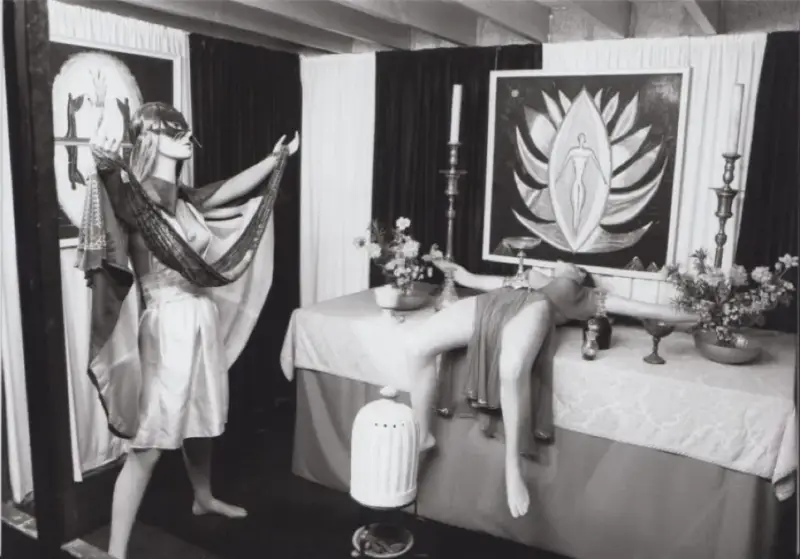 Mlada žena leži raširena na oltaru u crvenoj haljini od viskoze. Kalež joj stoji na trbuhu, ruke pruža prema teškim mjedenim svijećnjacima, dok joj stopala vise bijela poput ljiljana. Set je ukrašen svježim cvijećem, bočicama parfema i mastima. Čini se bestežinskom, napuštenom u svom zvjezdano istegnutom tijelu. Njezino lice, naslonjeno na grivu raspuštene kose, skriveno je od nas, kao i njezine misli. Njezin otkriveni vrat se okreće unatrag i upire te nevidljive oči u sliku obješenu iza nje - koja prikazuje plamteću vesicu iz koje izlazi lik. Na tlu između njezinih nogu se nalazi posuda u obliku košnice, iznad žeravnice, očito kultni objekt i, obzirom na položaj, od središnje važnosti za obred.