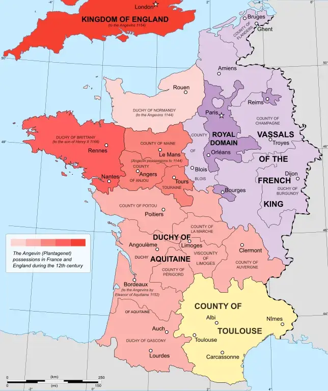 "Francuska" oko 1154. - 1189. Teritorij Henrika II je u crvenoj boji, a Filipova "Francuska" u ljubičastoj boji. Imajte na umu da Toulouse (žuto) koji je danas vrlo jasno dio Francuske, nije pripadao nijednoj. Zapravo, nijedna od ovih francuskih granica nije ista kao danas.