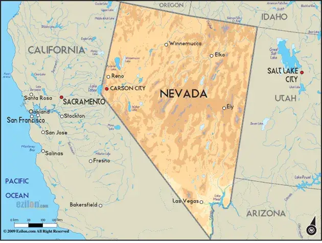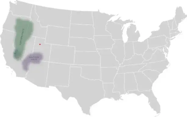 Karta područja sjevernog i južnog plemena Paiute, otprilike kako je izgledalo tijekom 1870-ih. Kao što se može vidjeti na karti, Paiute su se nalazili na području današnje zapadne Nevade, istočnog Oregona i jugoistočnog Utaha. Središte Mormonske crkve u to vrijeme bilo je u Salt Lake Cityju, sjedištu Mormonske crkve, što je označeno crvenom točkom.