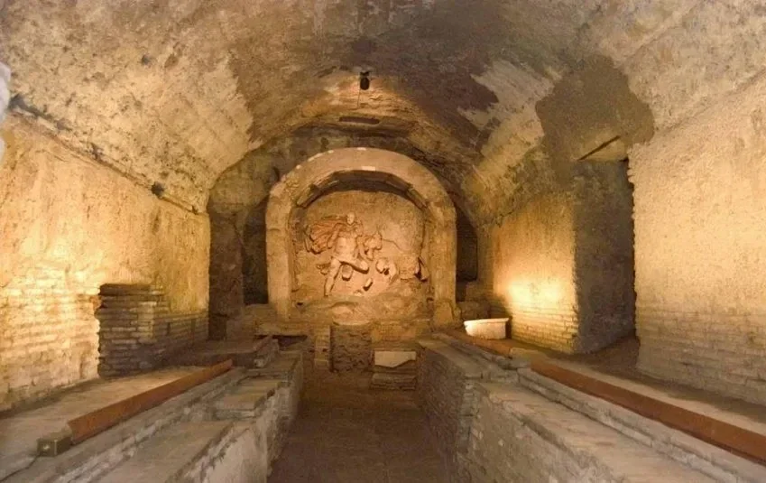 "Nakon toga, dominantni kršćani su pokušali iskorijeniti religiju sa svim žarom progona, koji su i sami nedavno pretrpjeli, oskvrnuli su svetišta, pa čak i ubijali mitraističke svećenike. U saarburškom mitreju je pronađen kostur čovjeka kako leži licem prema dolje, sa zapešćima vezanim željeznim lancem iza leđa, vjerojatno svećenik ubijen i ritualno proklet. Njegov pokop u svetištu ga je trebao oskvrnuti za cijelu vječnost."