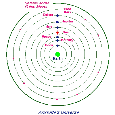 Zamišljao je svemir kao potpuno uređeno mjesto, sa Zemljom točno u središtu, nepomičnom i stabilnom, dok su nebesa iznad niz savršenih, nepromjenjivih sfera. Te su sfere nosile zvijezde, planete i druga nebeska tijela u kružnim orbitama oko nas. Ključna ideja jest da je na nebesa gledao kao na vječna i nepromjenjiva, bez kometa koji se sudaraju ili zvijezda koje nestaju iz postojanja.