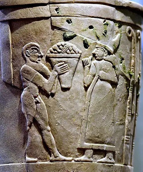 Inanna prima prinose. Prikaz na vazi iz razdoblja Uruka IV.