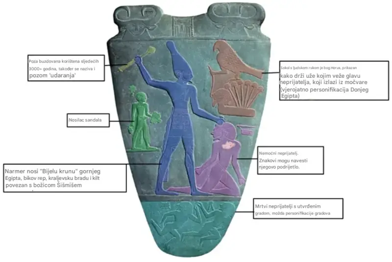 Pod Narmerovim nogama leže još dvije žrtve, sa malom slikom utvrđenog grada iznad i desno od njih.