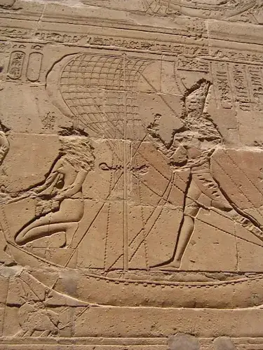 U scenama se Horus pojavljuje kao osvetnik svog ubijenog oca Ozirisa, pokrećući tako kozmičku i pravnu kampanju protiv Seta, koji je (više puta i dosljedno) simboliziran kao nilski konj. Horus je prikazan kako stoji u čamcu, ubada harpunom nilskog konja, dok se ptolomejski kralj pridružuje činu i ritualno udara isto stvorenje. Popratni tekstovi identificiraju ovaj čin kao sud i kaznu Seta, uokviruju nasilje kao božansku pravdu i kraljevsku dužnost. Nilski konj je ranjen, vezan, više puta proboden, ritualno savladan, a njegovo uništenje označava obnovu ma'ata i osvetu za Ozirisa.