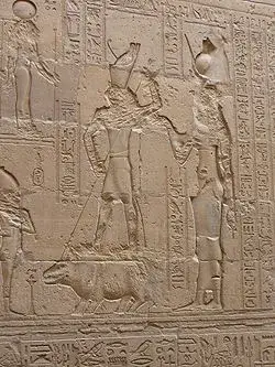 Unutar istog političkog i religijskog konteksta, 237. godine prije Krista, započela je izgradnja monumentalnog novog hramskog kompleksa u Edfuu, u Gornjem Egiptu. Posvećen Horusu, ovaj hram bi postao najopsežnije, i teološki najrazrađenije Horusovo svetište, u cijelom Egiptu. Njegovi zidovi čuvaju detaljan mitološki program uklesan u reljefu, popraćeno dugim hijeroglifskim natpisima, posebno na unutarnjim stranama istočnih i zapadnih ogradnih zidova. Ovi reljefi ne aludiraju samo na mit; to je pažljivo izvedena sveta drama, poznata kao Horusov trijumf, koja je ritualno ponovno izvedena i doktrinarno autoritativna.
