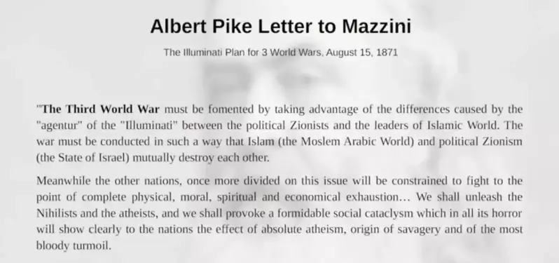 Ovaj odjeljak uključuje navodno 150 godina staro pismo koje je napisao Albert Pike, slobodni zidar 33. stupnja. U ovom pismu je navodno predvidio Prvi, Drugi i Treći svjetski svjetski rat, zajedno s njihovim približnim uzrocima. Pismo je brzo izazvalo zanimanje kroz krugove zavjere, alternativne medije, pa čak i MSM.