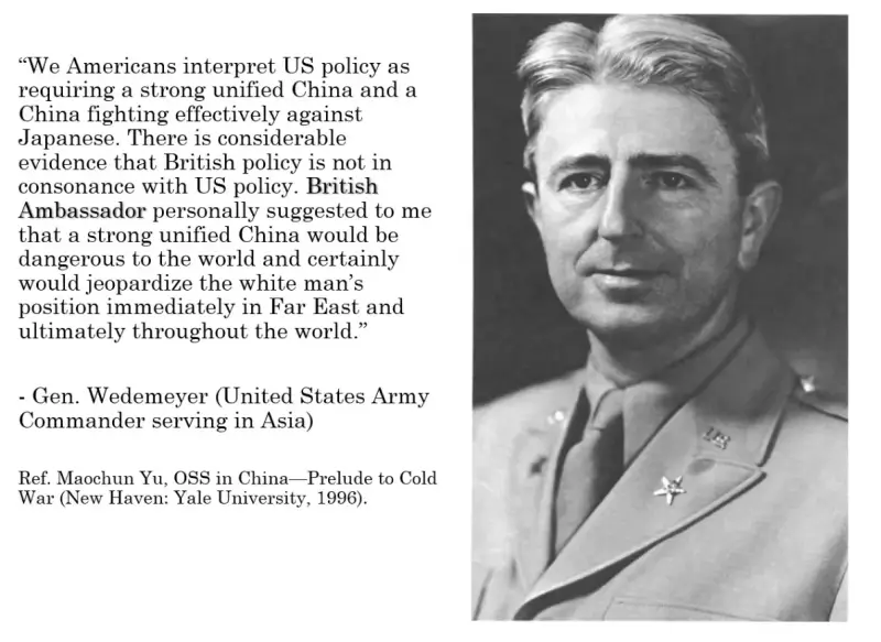 General Wedemeyer, koji je bio zapovjednik vojske Sjedinjenih Država, koji je služio u Aziji tijekom Drugog svjetskog rata od listopada 1943. godine do kraja rata, prepoznao je jedan od glavnih razloga zašto KPK (Komunistička partija Kine) i Kuomintang nisu bili u mogućnosti formirati savez protiv Japanaca. Problem je nastao je zbog britanske sabotaže i poticanja sukoba. Britanci su igrali istu staru imperijalnu igru raspirivanja zle krvi koja se već razvila između dviju skupina, prastaru igru zavadi pa vladaj. KPK je prepoznala kako bi to u konačnici dovelo do rasparčavanja Kine - ukoliko zajednička unija Kine protiv japanskih imperijalista ne bude istaknuta kao prioritet broj jedan, i ne bude prije svega.