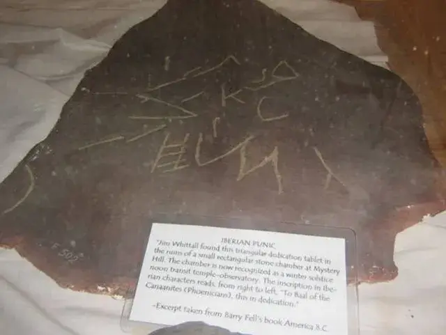 Ova je ploča pronađena prije mnogo godina kada je vlasnik posjeda iz New Hampshirea otkrio malu kamenu komoru na mjestu koje je danas poznato kao Mystery Hill. Natpis proto-kanaanskim slovima glasi "Baalu od Kanaanaca, ovo kao posveta".