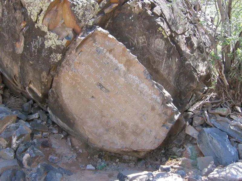 Ova stijena poznata je kao kamen dekaloga Las Lunas i otkrivena je izvan Las Lunasa, NM, 1933. godine. Mještani su tvrdili kako je oduvijek bila tu, a svjedočanstva očevidaca potvrdila su to sve do 1880. godine. Zbog lišajeva i oksidacije bilo je jedva čitljivo. Ova fotografija je snimljena nakon vandalizma i rušenja kamena 2006. godine, vidljivog na vrhu. Uredno isklesan na istom proto-kanaanskom, ranom feničkom pismu kao gore, sadrži Deset zapovijedi Tore.