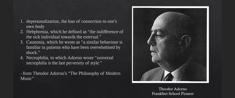 Još jedna osoba, koja je bila veoma svjesna o čemu se radi, bio je Theodor Adorno. U slučaju Adorna, korištenje glazbe bilo je krajnji alat primjene u masovnom društvenom biheviorizmu. Theodor Adorno, koji je u mladosti bio koncertni pijanist koji je obećavao i koji je kasnije studirao u Beču kod atonalnog skladatelja Arnolda Schoenberga. Godine 1946., dok je u Sjedinjenim Državama radio na agendi “kulturnog pesimizma” Frankfurtske škole, napisao je knjigu “Filozofija moderne glazbe”, oštru kritiku klasične kulture.