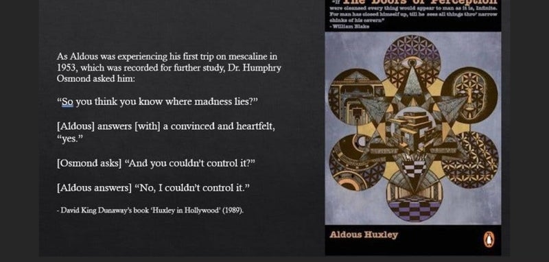 Huxleyevo iskustvo uzimanja meskalina, u prisutnosti dr. Humphreya Osmonda 1953. godine, nadahnulo je njegovo pisanje knjige "Vrata percepcije", koja se smatra biblijom kontrakulturnog pokreta.