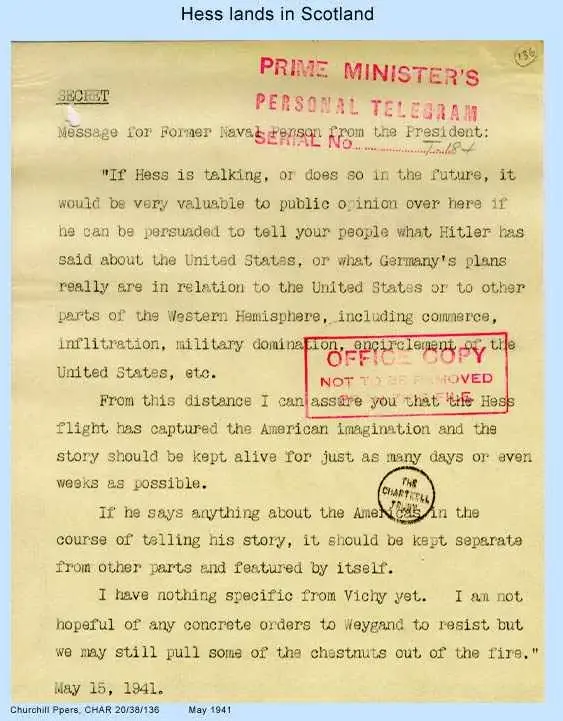 Churchill je odbio mirovni prijedlog i zadržao je Hessa kao ratnog zarobljenika, u vojarni Maryhill. Kasnije je Hess prebačen u Mytchett Place, blizu Aldershota. Kuća je opremljena mikrofonima i opremom za snimanje zvuka.