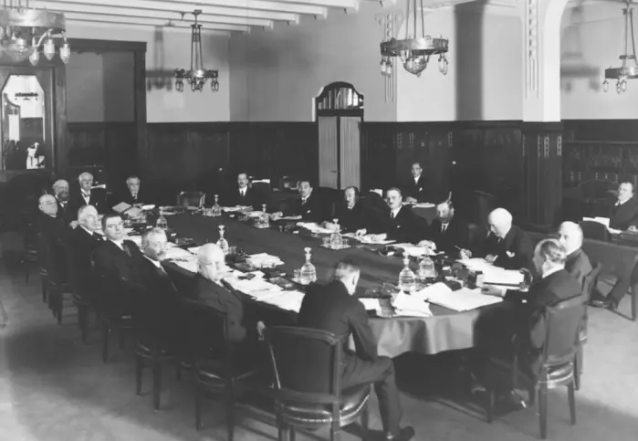 "Za financiranje rata 1914.-1918., Britanija i Francuska su uzimale kredite od američkih banaka, uglavnom od JP Morgana; te su od 1919. morale početi otplaćivati te kredite, plus kamate. Teškoća, ali ne niti najmanje, za banku JP Morgan, bila je u tome što su Britanija i Francuska ratom praktički bankrotirale i borile su se s plaćanjem svojih ratnih dugova Sjedinjenim Državama.