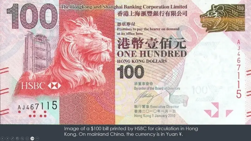 HSBC je do danas zadržao pravo tiskati 1/3 hongkonške valute. Jedine druge dvije dopuštene agencije su Standard Chartered Bank (još jedna britanska multinacionalna banka, sa sjedištem u Londonu) i Bank of China, jedina banka u kineskom vlasništvu. Dakle, Kina ima ovlast tiskati samo 1/3 hongkonške valute, iako je Hong Kong legalno priznat i dijelom je Kine. Osim toga, HSBC se nalazi na crnoj listi stranih tvrtki u Kini - jasan pokazatelj koliko Kina ima kontrole u Hong Kongu, u usporedbi s britanskim utjecajem.