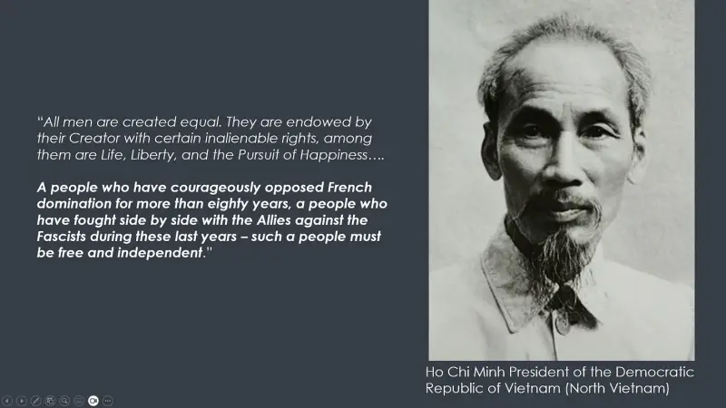 Podsjetimo se: Ho Chi Minh se borio protiv Japanaca. Odnosno, mnoge azijske zemlje su se borile protiv japanskog fašizma, u nadi da više neće biti kolonije. Vijetnam je, u to vrijeme, još uvijek bio francuska kolonija. Kada je Ho Chi Minh proglasio neovisnost Vijetnama, budući je surađivao sa Amerikancima tijekom Drugog svjetskog rata i to mu je obećano - Francuzi su, samo nekoliko mjeseci nakon Drugog svjetskog rata, ušli ravno u Vijetnam kako bi zaštitili svoju kolonijalnu imovinu.