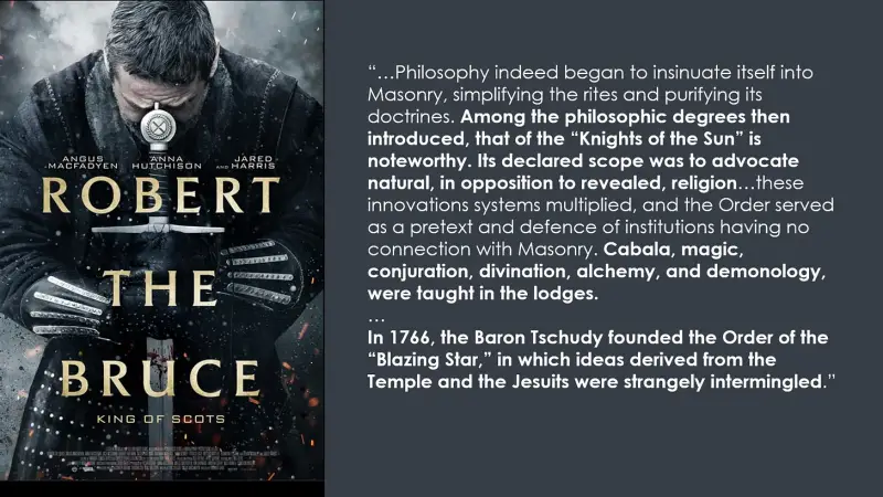 Dakle, ukoliko je sve ovo točno, onda je Robert Bruce zabio nož u leđa Williamu Wallaceu, ugrozio time pravu revoluciju Škota i Iraca, zatim instalirao lažnu revoluciju, ali je uvijek bio u službi Britanskog Carstva. Imamo francusko i britansko slobodno zidarstvo. Britanci su prvi vratili moderno slobodno zidarstvo. Dakle, Robert Bruce je kreirao lažnu revoluciju, dok je cijelo vrijeme zapravo bio kanal za aktivnosti slobodnog zidarstva. Zato ćete primijetiti da u Škotskoj ima puno oligarha; ima puno škotskih izdajnika, koji su postali vrlo moćni i utjecajni po Škotskoj, ali i Irskoj. Ovo bi moglo biti dobro objašnjenje zašto.