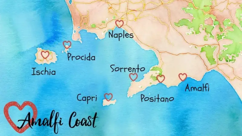 Na gornjoj karti se može vidjeti obala Amalfija, uz: