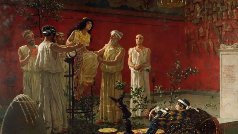 Orgija iz vremena Tiberija na Capriju, autora Henryka Siemiradzkog (1881.), prikazuje spoj ljudskog žrtvovanja i bakhanalijskog ludila proslave Mjeseca.