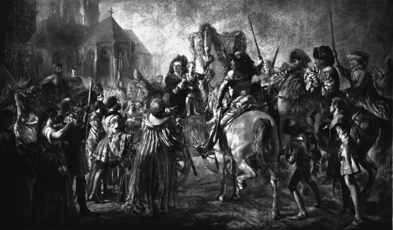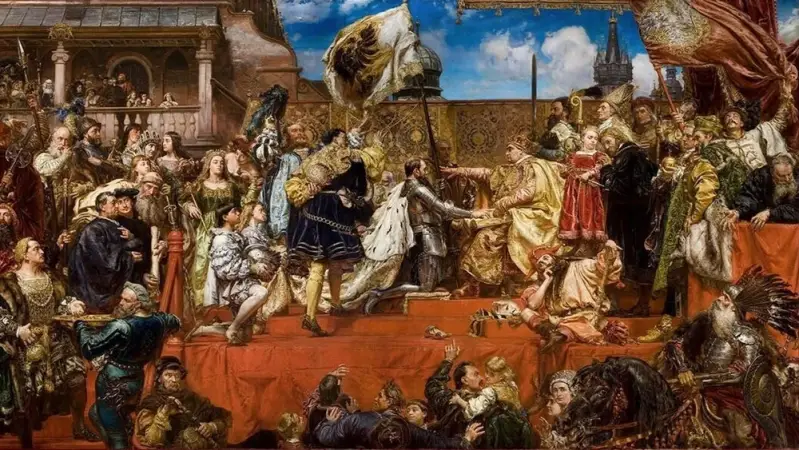 Albert Pruski (1490.–1568.), veliki majstor Teutonskih vitezova, i njegova braća, dobivaju Prusko vojvodstvo kao feud od Sigismunda I. Starog, 1525. godine (od Matejka, 1882.)