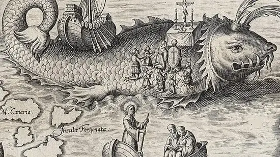 Insula Fortunata (Sretni otoci), nacrtana istočno od Kanarskih otoka; na ovoj karti koja prikazuje sv. Brendana, irskog redovnika iz 06. stoljeća koji je, prema legendi, otputovao duboko u Atlantik.