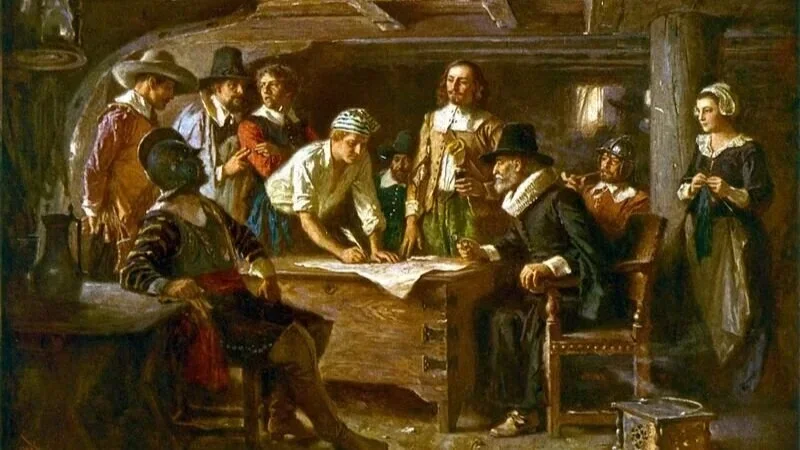 Putnici Mayflowera potpisuju tzv. "Mayflower Compact", uključujući: Carvera, Winstona, Aldena, Mylesa Standisha, Howlanda, Bradforda, Allertona i Fullera.