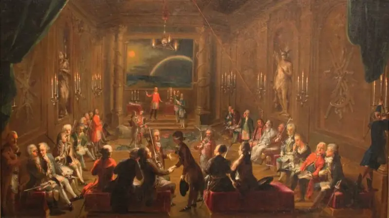 Sastanak masonske lože iz Mozartovog vremena, za koji se nekada smatralo da prikazuje Mozartovu vlastitu ložu (1789.)