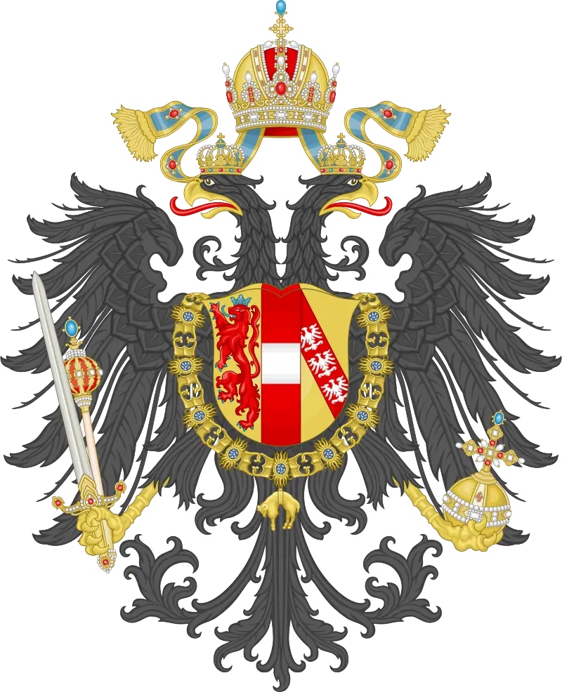 Carsko-kraljevski grb Austrijskog Carstva: dvoglavi orao (Reichsadler), sa maršalom grbova Habsburga, Babenberga i Lorraine, prikazan na štitu, Red zlatnog runa i Carska kruna.