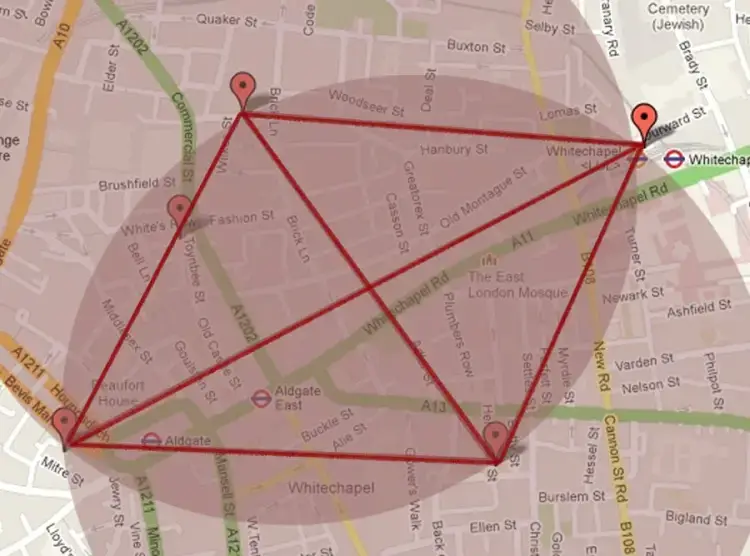 Edwards napominje kako geometrijski položaji ubojstava padaju izravno na kutove dvaju trokuta (ili jednog paralelograma), unutar dvaju preklapajućih krugova. Ovu figuru okultisti tisućljećima nazivaju 'Vesica Piscis'.