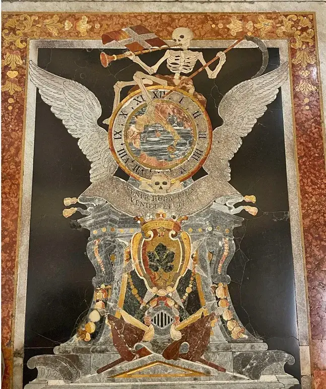 Još jedna slika nadgrobnog spomenika iz konkatedrale sv. Ivana u Valletti na Malti. Ovdje vidimo malteški grb: srp sa simbolom Ouroborosa, zmije koja proždire vlastiti rep, što predstavlja vječni ciklus uništenja i ponovnog rođenja, sa prikazom mrtvog viteza koji zaustavlja ili prekida vrijeme, što simbolizira njegovo razbijanje sata.