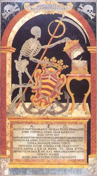 Na gore prikazanom nadgrobnom spomeniku se nalazi prikaz kostura pokojnog viteza, sa srpom u jednoj ruci i sa trubom na koju je pričvršćena zastava Malteških vitezova u drugoj ruci. Sjedi na satu, unutar kojeg se nalazi karta Mediterana, te dva velika krila (po jedno sa svake strane). Ova krila simboliziraju Malteške vitezove križare.