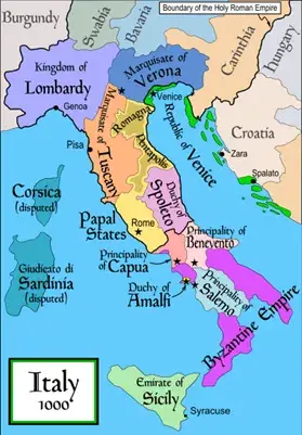 Granice označene debelom linijom označavaju granicu Svetog Rimskog Carstva, dakle južna Italija i Sicilija nisu dio Svetog Rimskog Carstva u to vrijeme. Primijetite da je Amalfijsko vojvodstvo, koje je postalo simbol Vitezova sv. Ivana Jeruzalemskog u to vrijeme, bilo pod vlašću Bizantskog Carstva, što je vjerojatno uključivalo i otok Capri.