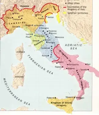 Detalji ove složene povijesti nadilaze okvire ovog teksta. Važno je ovdje istaknuti da je postojalo vrlo veliko neslaganje između svetog rimskog cara Fridrika II. i Papinske Države oko pitanja križarskih ratova, pri čemu se Fridrik II. organizirao za ekumenizam, diplomaciju i mir, dok je Papinska Država zalagala za kršćansku dominaciju (tj. vjersku i političku), teritorijalne dobitke i uklanjanje utjecaja drugih religija i kultura. Također je važno istaknuti da je Kraljevstvo Napulj bilo pod francuskom vlašću stoljećima prije nego je došlo pod španjolsku vlast. Italija će se ujediniti kao teritorij kakav poznamo danas tek u 19. stoljeću, uz jedinstveni jezik.