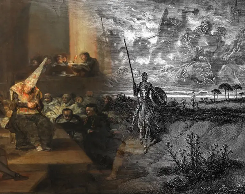 Slika lijevo: Slika pod nazivom „Inkvizicijski sud“ Francisca Goye (1808.-1812.). Slika desno: Gravura „Don Quijotea“ Gustava Doréa (1860-ih), temeljena na romanu Miguela Cervantesa, prvi put objavljenom 1605. godine, koji je bio fikcija inspirirana Bratstvom Garduna, prvom mafijom, koja je bila u službi španjolske inkvizicije 340 godina.