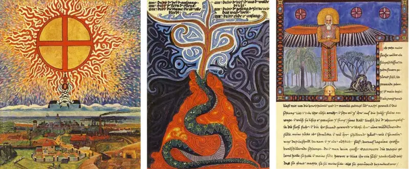 Umjetnička djela iz Jungove "Crvene knjige": Crveni križ, Zmija i drvo, te Filemon.