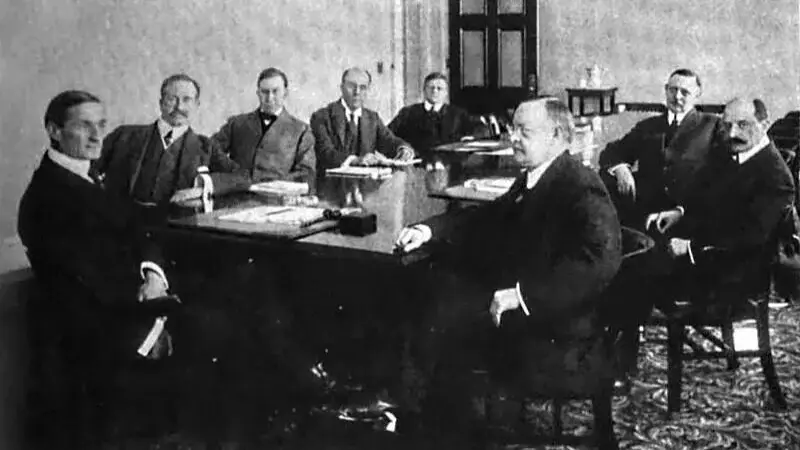 Osoblje Istražnog odbora na Pariškoj mirovnoj konferenciji. Sjede (slijeva nadesno): Charles H. Haskins, Zapadna Europa; Isaiah Bowman, šef Teritorijalne obavještajne službe; S. E. Mezes, direktor; James Brown Scott, Međunarodno pravo; David Hunter Miller, Međunarodno pravo; Stoje: Charles Seymour, Austro-Ugarska; R. H. Lord, Poljska; W.L. Westermann, Zapadna Azija; Mark Jefferson, Kartografija; Pukovnik House; George Louis Beer, Kolonije; D.W. Johnson, geografija; Clive Day, Balkan; W. E. Lunt, Italija; James T. Shotwell, Povijest; A. A. Young, Ekonomija.